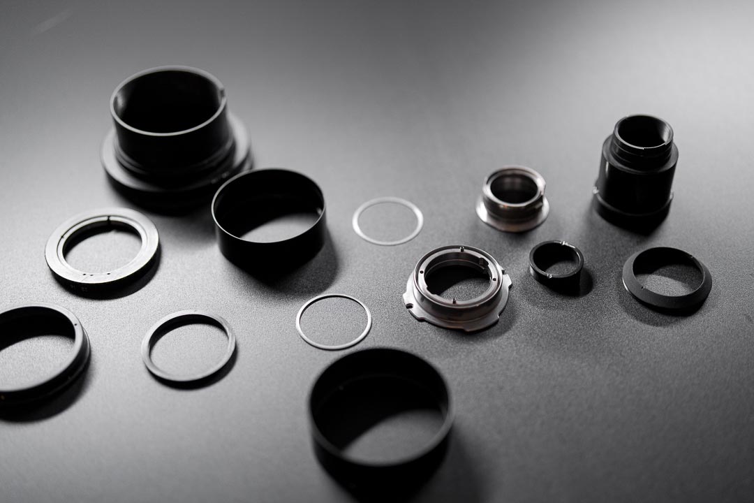 Le lavorazioni includono ghiere di messa a fuoco e diaframma, mount custom o adattati, distanziatori, anelli e componenti meccanici speciali.